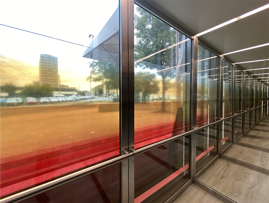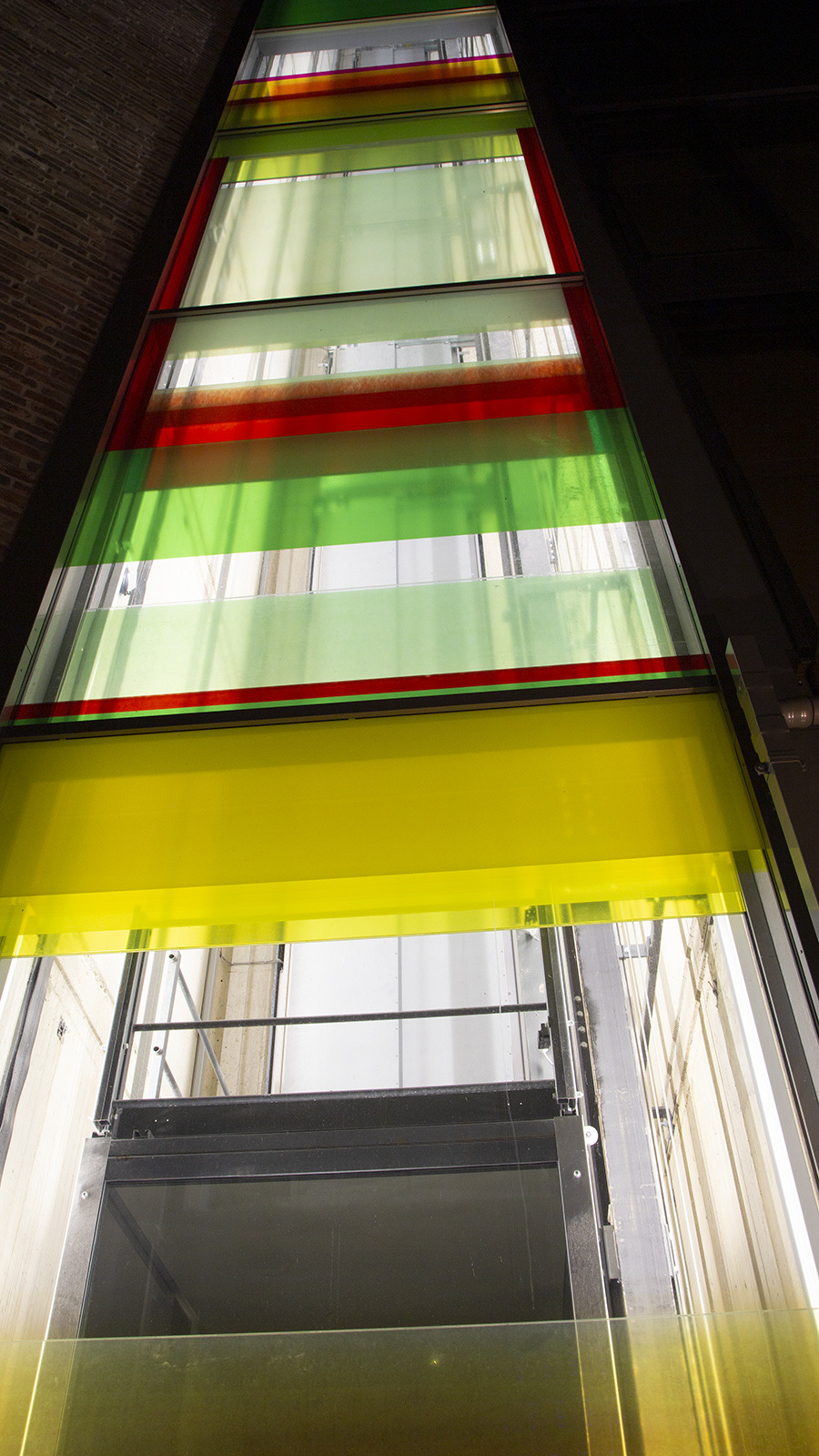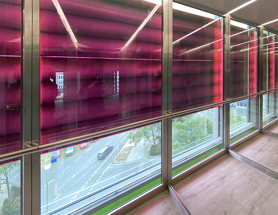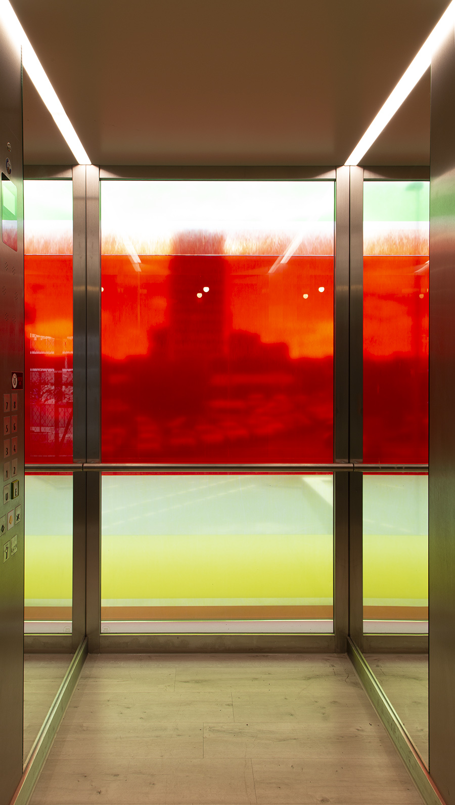 art in architecture - creation of the glass facade - inside view of an elevators cabin of the Flowers-Hotel in Essen