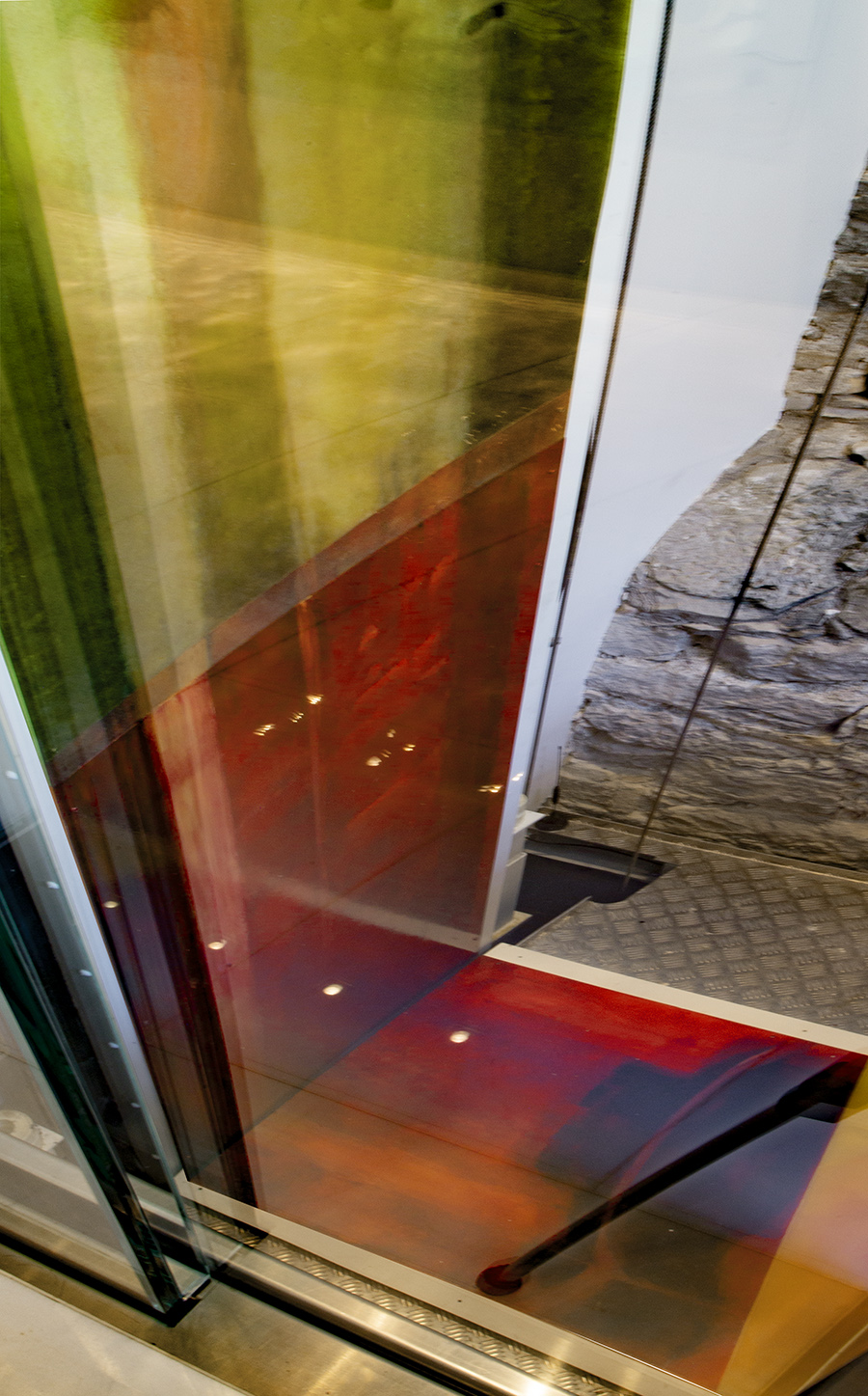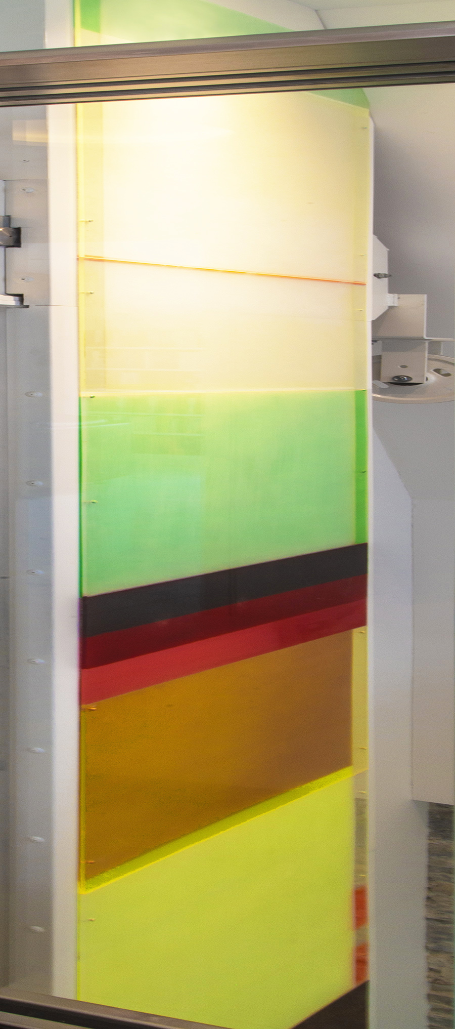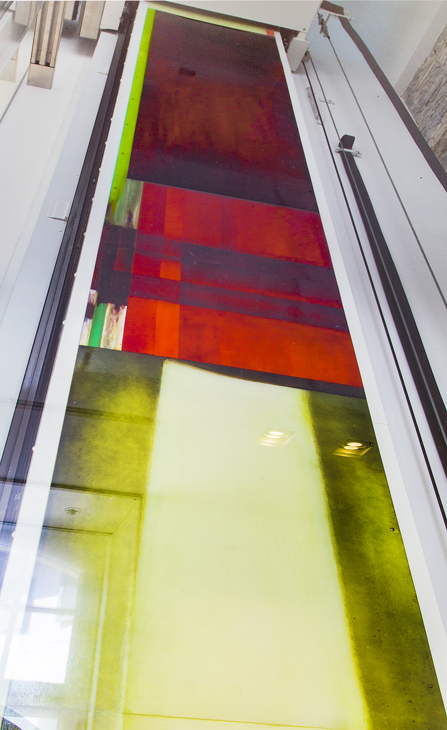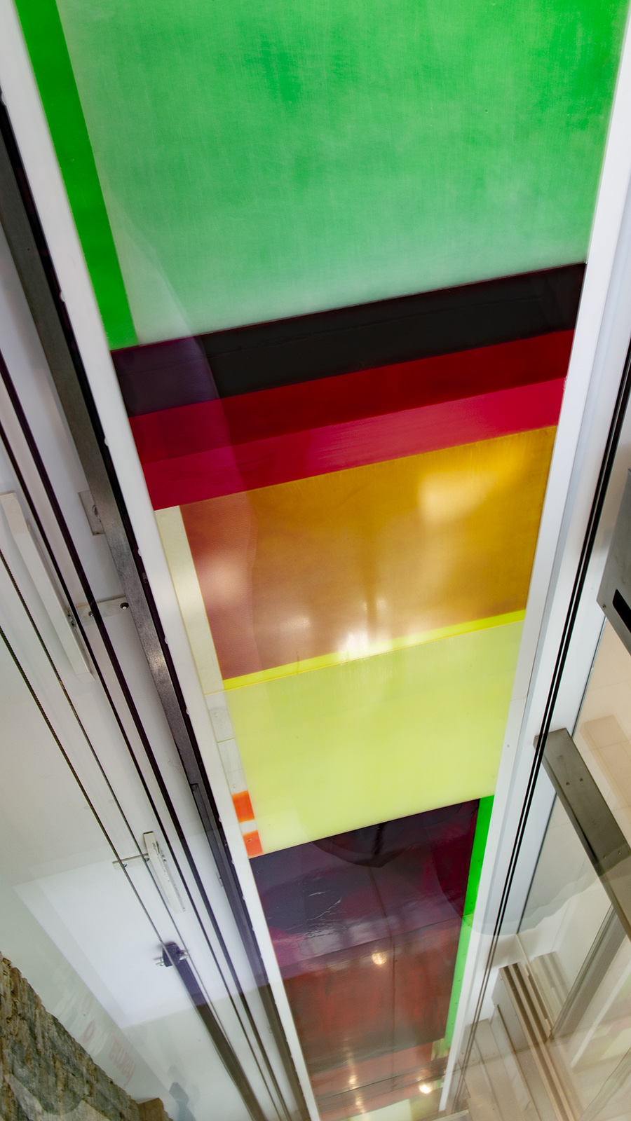 Transluzides 03/15, color laquer and oil coulor on polyester and acrylic glass, 1280 x 71 x 2 cm - Composition behind a transparent elevator